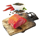 Тунец – ценная промысловая рыба, обладающая плотным мясом насыщенного красного цвета. Благодаря этому, а также высокому содержанию белка, эту рыбу сравнивают с телятиной или мраморной говядиной. Приготовленный способом холодного копчения тунец является изысканным деликатесом, который определённо должен попробовать каждый, кто ещё не имел такого удовольствия. Пропитанная лёгким ароматом дыма от древесной щепы мякоть приобретает насыщенный неповторимый вкус, который, в сочетании с плотной структурой волокон, очень напоминает мясо молодых телят. Тунец холодного копчения идеально впишется в состав рыбной тарелки для подачи на праздничный стол и станет вариантом изысканного завтрака, уложенный тонким ломтиком на кусочек свежего белого хлеба.
