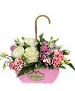 Букет №2 . Цветочная композиция из роз и тюльпанов с оформлением, в корзинке с надписью Flowers.