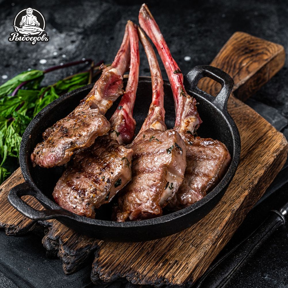 Разогрейте гриль или сковороду-гриль. Обжарьте каре ягнёнка на сильном огне по 2–3 минуты с каждой стороны до румяной корочки.