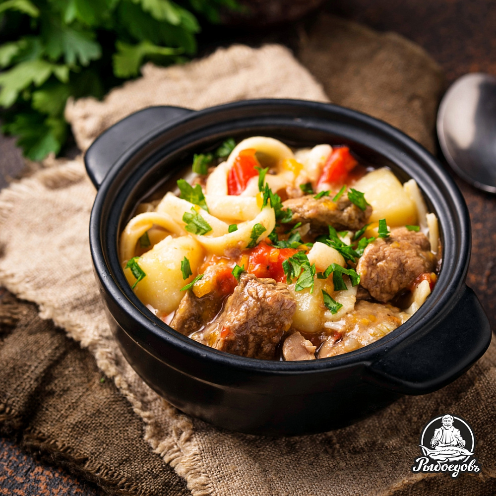 Влейте горячую воду или бульон, добавьте картофель, специи (соль, перец, зиру, паприку). Тушите под крышкой 40-50 минут, пока мясо и картофель не станут мягкими.
