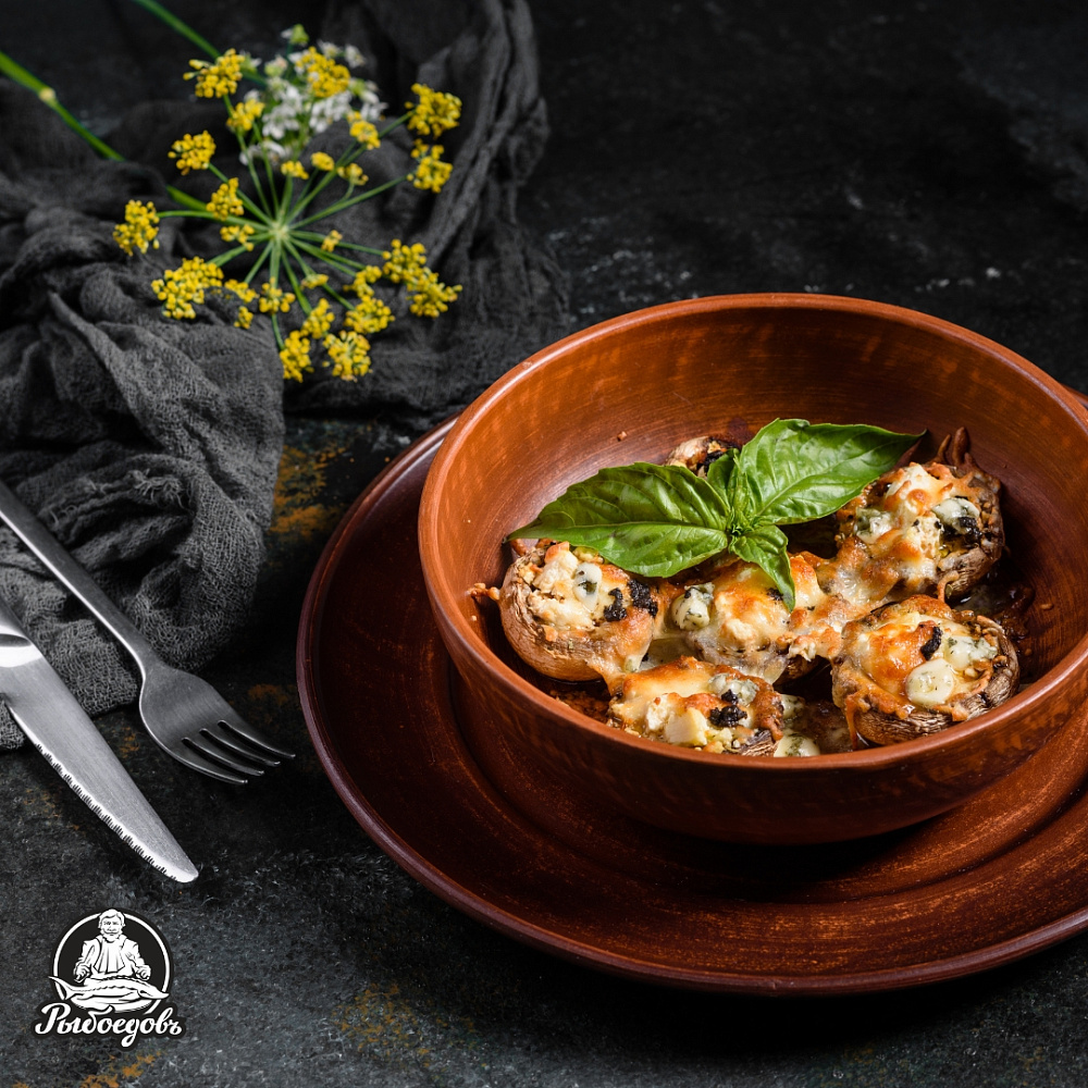 Готовьте в разогретой духовке до 180 градусов около 20-25 минут, пока грибы не станут мягкими и фарш не пропечется.