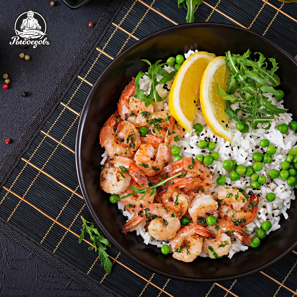 Выложите креветки на тарелку к рису.