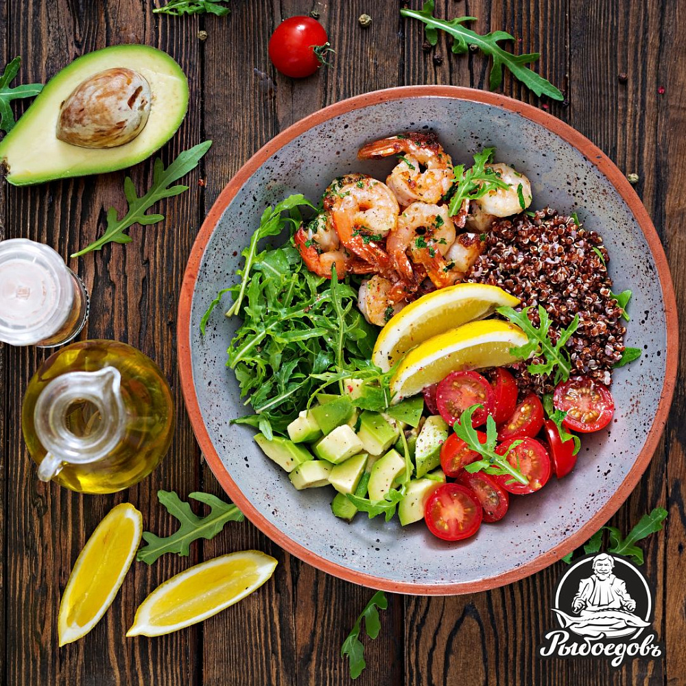 3️⃣ В большой миске сочетайте киноа, жаренные креветки, нарезанное авокадо, рукколу и помидоры. Полейте оливковым маслом и аккуратно перемешайте, чтобы все ингредиенты равномерно соединились. Попробуйте и, при необходимости, добавьте соль и перец по вкусу.