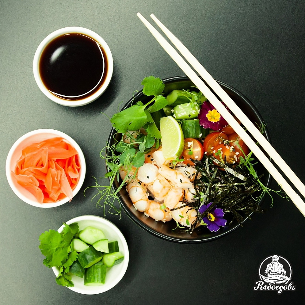 6. Сверху по кругу выложить креветки, помидоры черри, огурцы, ростки горошка и кинзу.