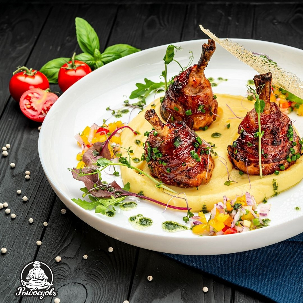 - Подача: На тарелку выложите картофельное пюре, сверху разместите запеченные голени. Рядом с пюре выложите овощной салат. Украсьте зеленью и каплями оливкового масла для украшения.