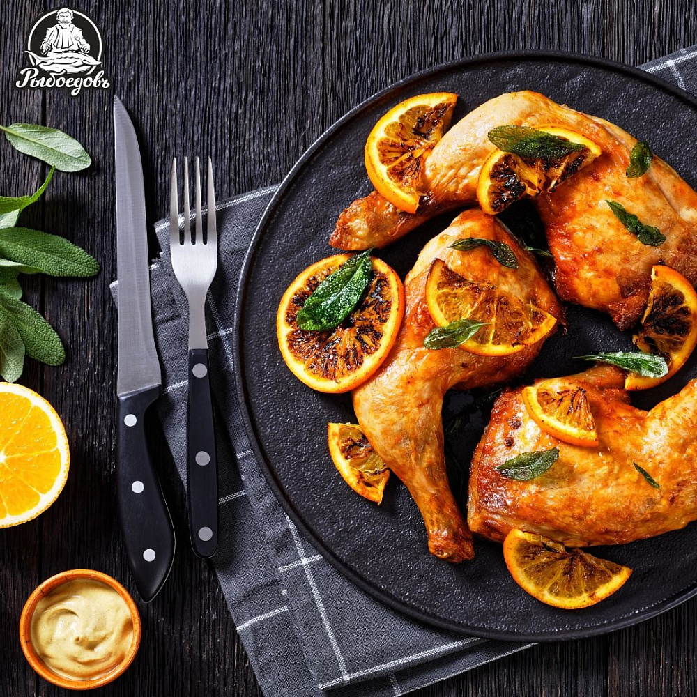 Выложите окорочка на противень, добавьте кружочки апельсина и выбранную зелень.