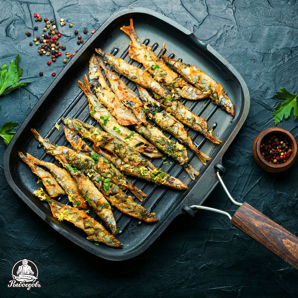 - Разогрейте сковороду-гриль или обычную сковороду. Выложите мойву и жарьте по 2–3 минуты с каждой стороны до появления золотистой корочки.
