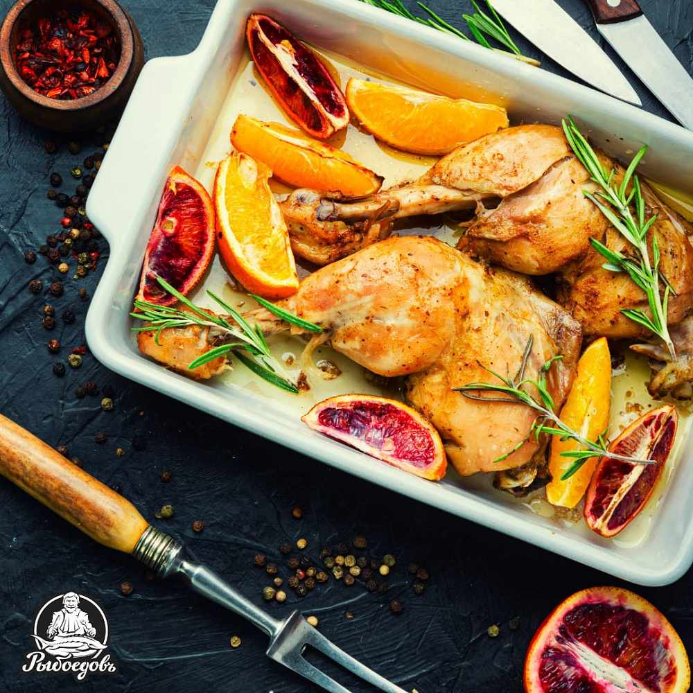 Добавьте в форму дольки чеснока и апельсинов, веточки розмарина и при желании - немного мёда для карамельной корочки.