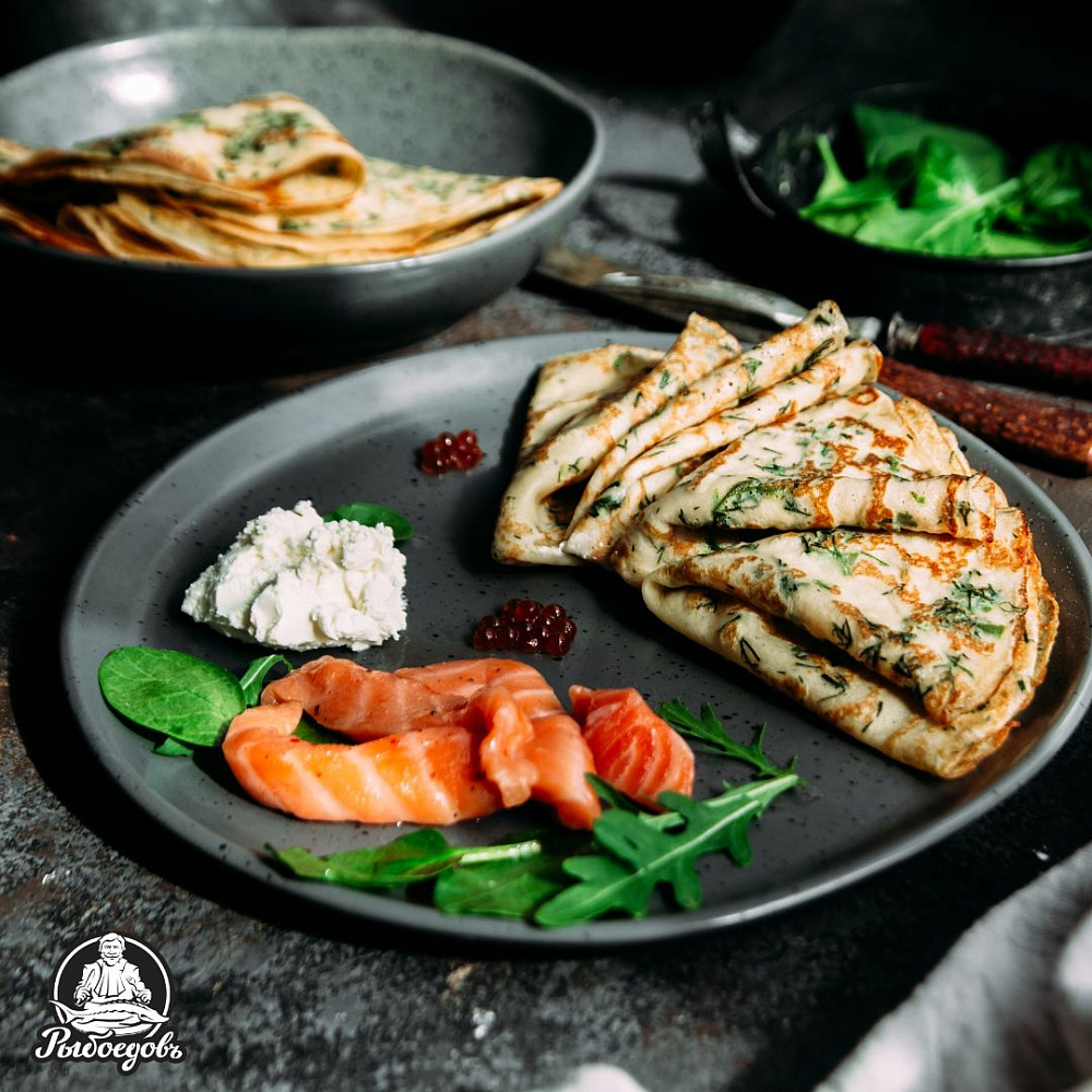 Подавайте блины, сложенные треугольниками или рулетиками, с ломтиками сёмги, сливочным сыром, зеленью и икрой.