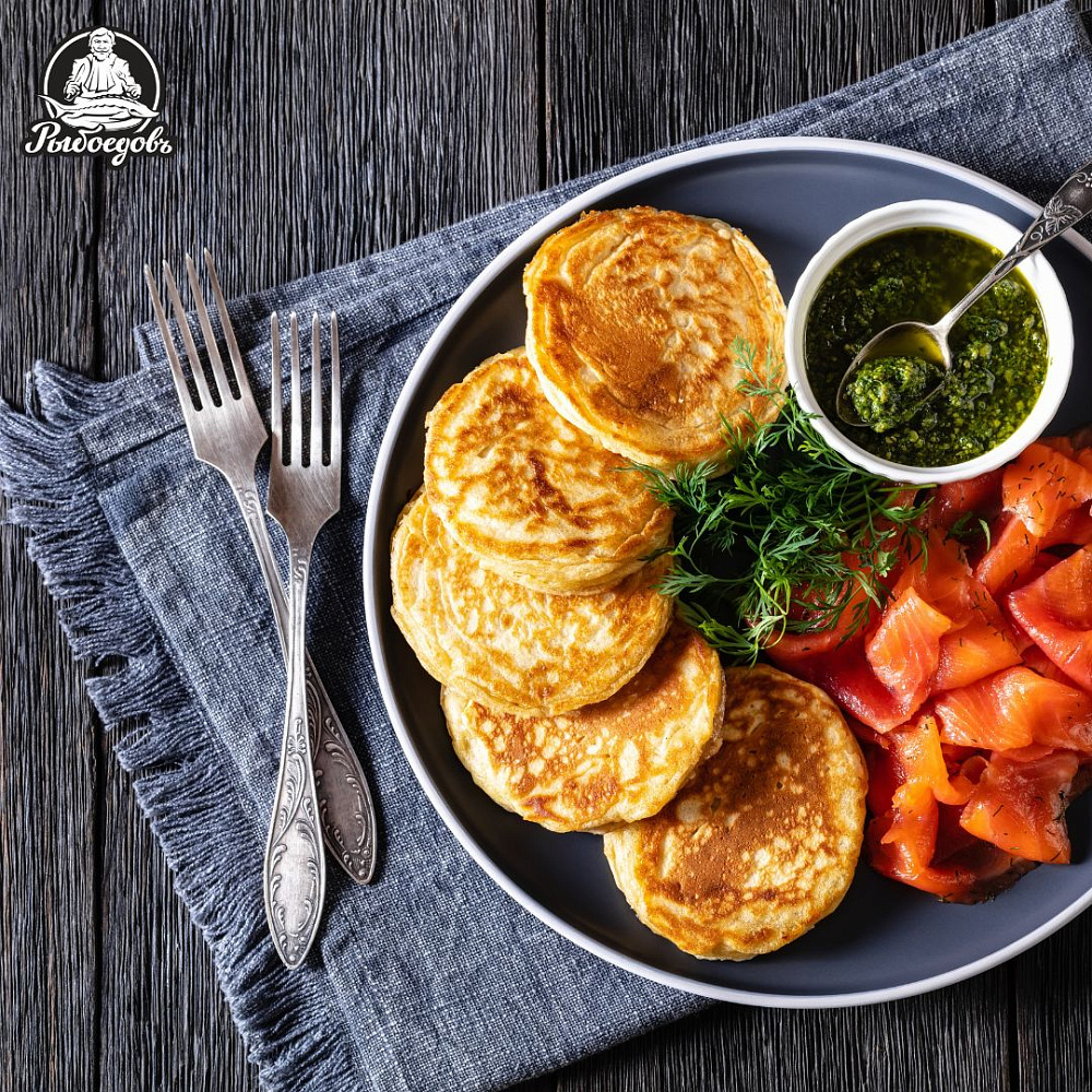 Выложите готовые оладьи на тарелку, подавайте со слабосоленой семгой, нарезанной тонкими ломтиками.