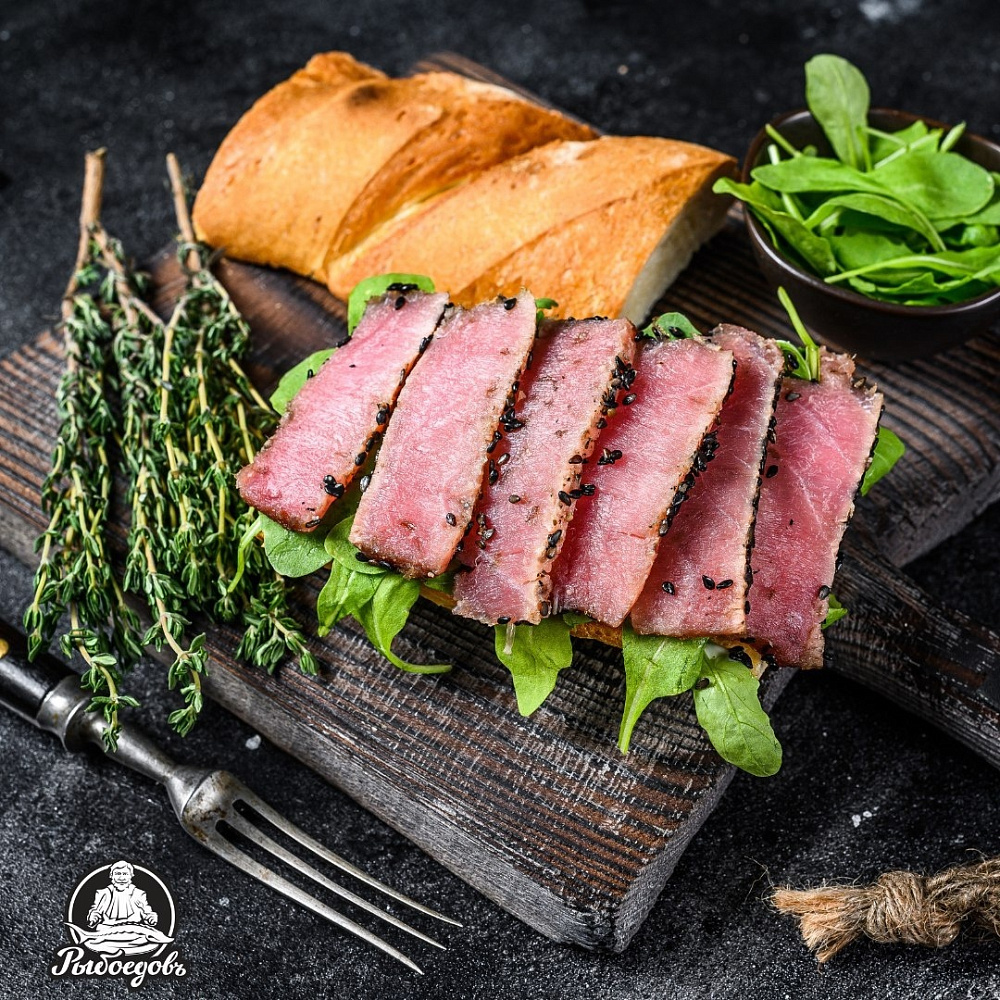 - Выложите на нижнюю часть багета слой свежей рукколы, сбрызните лимонным соком. Сверху разложите ломтики тунца. Посыпьте черным кунжутом.