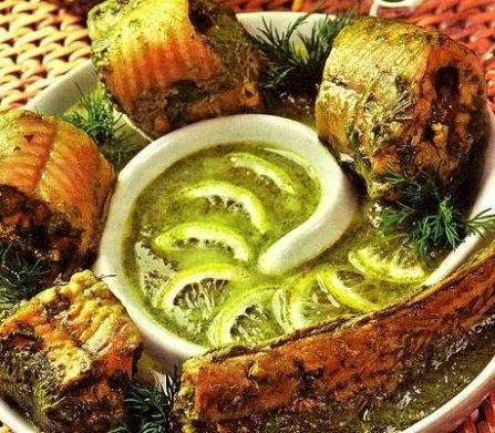 Снимаем кастрюлю с огня, перекладываем угря в тарелку. Быстро венчиком вбиваем в соус 3-4 желтка, предварительно смешав их с соком двух больших лимонов. Когда соус станет однородным, положим в соус рыбу так, чтобы он полностью покрывал её. Оставляем до тех пор, пока соус и рыба не остыну. Затем подаем к столу.